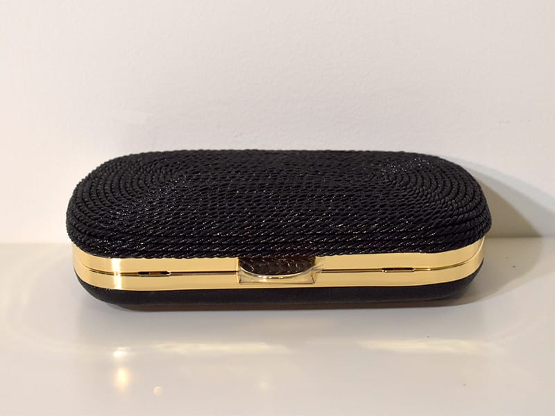 Bolso de mano para mujer. Cartera rígida rectangular en color negro. Por la parte delantera es de cordón y por la parte de atrás es lisa de color brillante. Realizado con cuerdas de hilo de seda. Cierre con broche dorado central. Lleva dentro una cadena para poder colgarla de bandolera. Se puede llevar como bolso de mano. Interior forrado. Nunca pasa de moda, es un modelo atemporal para tener de fondo de armario. Ideal para tus eventos más especiales!